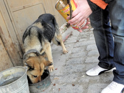 Náhodný okoloidúci sa zľutoval nad zvieraťom a kúpil mu konzervu s mäsom. Pes bol taký hladný, že jej obsah zožral za niekoľko sekúnd. Foto: Darina Kvetanová