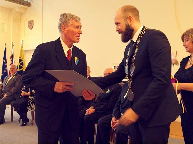 Držiteľom čestného občianstva mesta Trnava je aj Jozef Adamec (vľavo). Na fotografii zo slávnosti s primátorom Petrom Bročkom. Foto: Ján Král