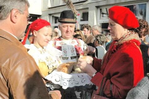 Pri prvej oficiálnej návšteve Cífera vítali domáci farníkov a obyvateľov Zillingtalu typicky slovansky – chlebom a soľou. Foto: Marián Pavlík