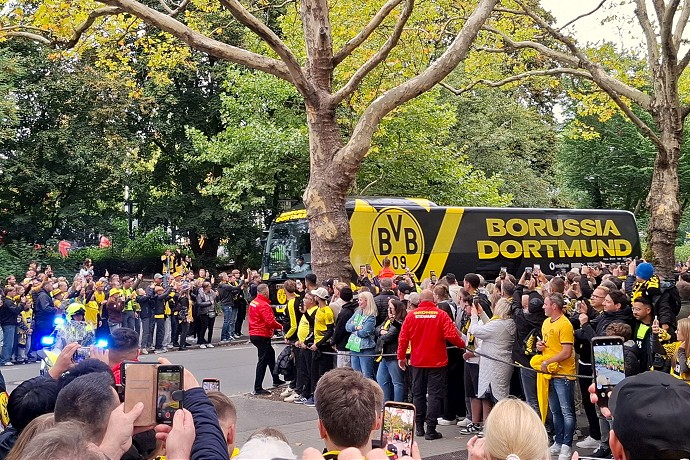 Príjazd futbalistov Dortmundu na štadión býva zhruba hodinu a pol pred zápasom. To už na mužstvo čaká dav fanúšikov. |