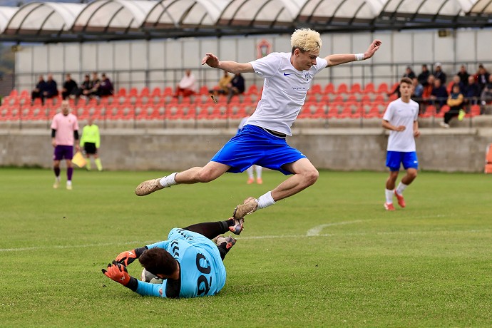 Prienik výbušného cíferského útočníka Jakuba Bukovca včasným vybehnutím zastavil gólman Kvašova.