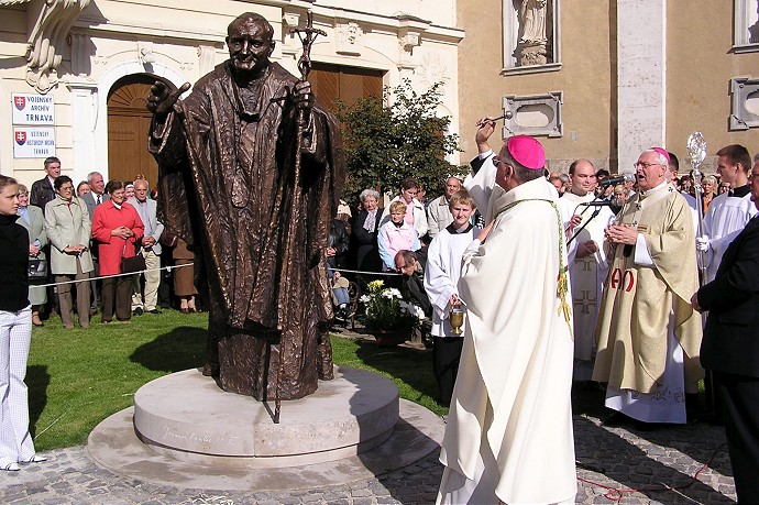 Socha pápeža Jána Pavla II. na Univerzitnom námestí v Trnave pripomína jeho návštevu v tomto meste už dvadsať rokov.