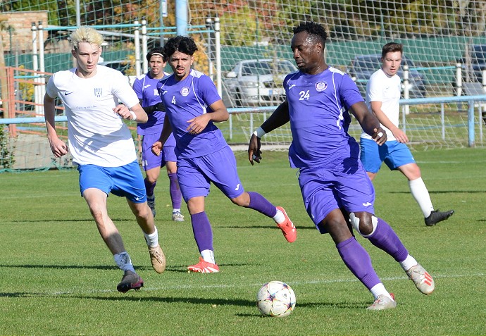 Prenikajúceho Jakuba Bukovca sa snaží zastaviť Nigerijčan Ayodeji Lawal (č. 24). Akcie prizerajú jeho hlohovskí spoluhráči Venezuelčan Manuel Andrade (č. 10) a Kolumbijčan Herrea Orjuela (č. 4), v pozadí Cíferčan Radovan Matlák.