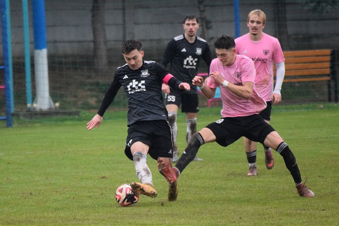 V Boleráze sa hralo do tela ale férovo. Domáci Peter Líška (v tmavom) v súboji s hosťujúcim Samuelom Valom.