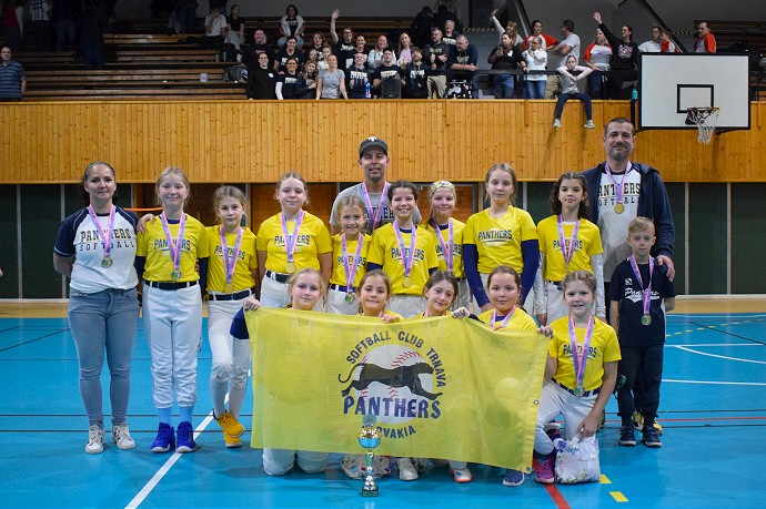 Panthers Trnava obsadili druhé miesto. Horný rad zľava: asistentka trénera Miriama Macurová, Sofia Jančovičová, Eliška Karabinová, Olívia Turanská, Viola Brežná, tréner Štefan Berhédi, Stela Hacajová, Alica Lojanová, Rebeka Zuryň, Sara Ječná, asistent trénera Vladimír Hacaj, asistent trénera Oliver Berhédi. Dolný rad zľava: Laura Kaličiaková, Karin Králová, Laura Horvathová, Nina Tisoňová a Ema Tibenská.