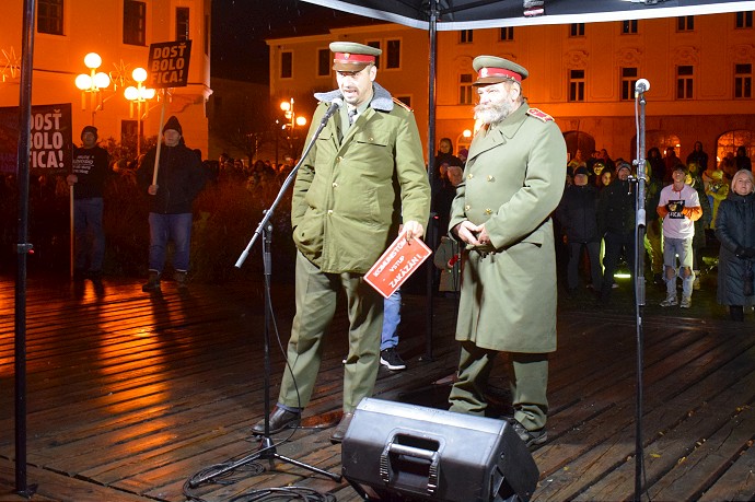 Zhromaždenie spestrili "príslušníci Verejnej bezpečnosti", teda veselej dvojice zo Záhoria, ktorí v Trnave hľadali Roberta Fica. S viacerými pesničkami vystúpil spevák a trnavský rodák Allan Mikušek.