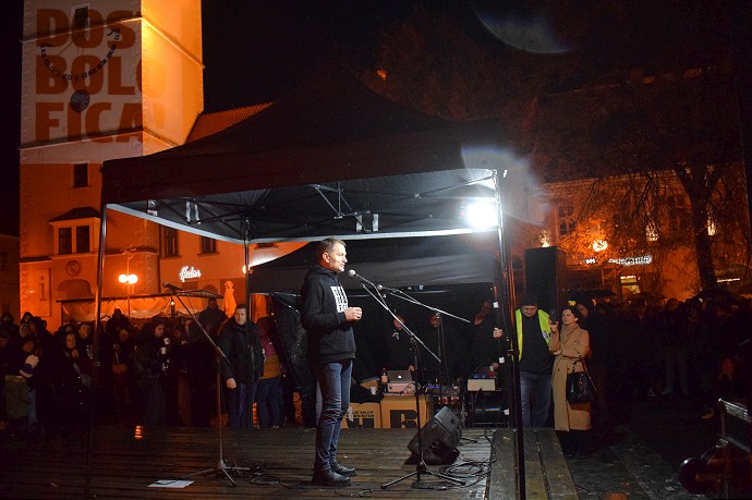 Priestor na pódiu dostal aj Karol Galek z SaS, ktorý pripomenul jedno z hesiel Novembra 1989 – Sľúbili sme si lásku. „Ale kam sa podela? Fico útočí na novinárov, študentov posiela na Ukrajinu a opozíciu viní z organizovania prevratu,“ povedal Galek.