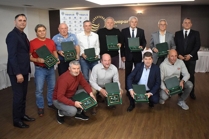 Plaketu ObFZ Trnava venovali k životným jubileám viacerým činovníkom klubov. V hornom rade zľava predseda ObFZ Trnava Vladimír Hracho, Drahomír Dobrovodský (60), Jozef Novák (70), Marek Vavro (50), Marián Špaček (70), Ladislav Benedikovič (70), Anton Pobjecký (70), predseda ZsFZ Peter Kováč. V dolnom rade zľava: Ondrej Koutný (50), František Gabriel (70), Ivan Hegedüš (60) a Peter Varga (50). Na fotografii chýba František Kolesík (60), ktorý nebol prítomný na konferencii.