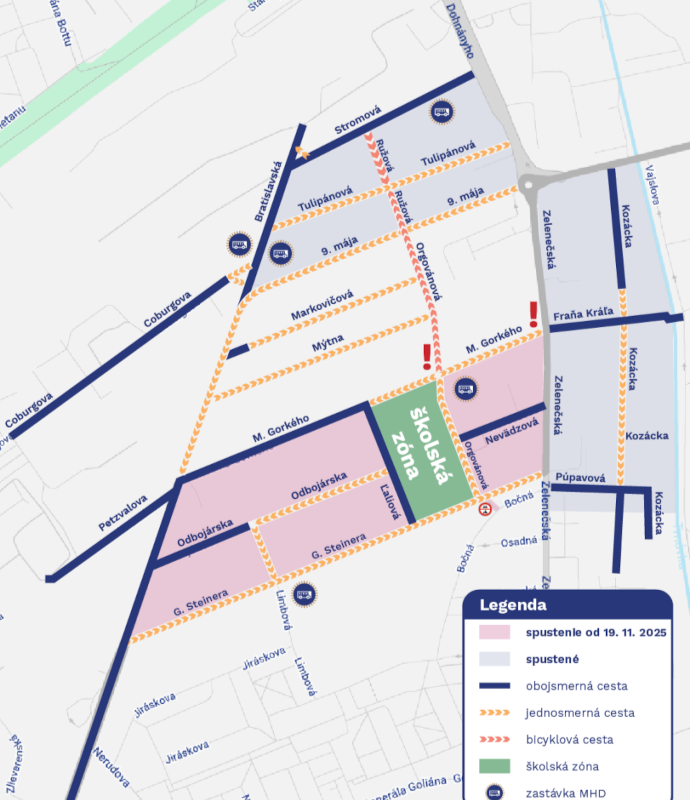 V okolí základnej školy vzniká nová školská zóna. Ohraničujú ju ulice M. Gorkého, Orgovánová, Ľaliová a G. Steinera.