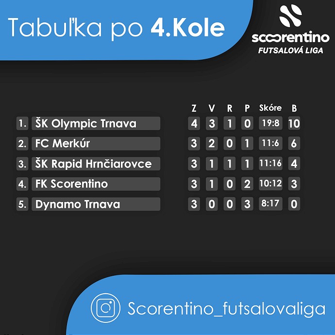 Olympic Trnava si v štvrtom kole Okresnej Scorentino futsalovej ligy upevnil pozíciu lídra. V priamom súboji o prvé miesto porazil druhý Merkúr 4:1.