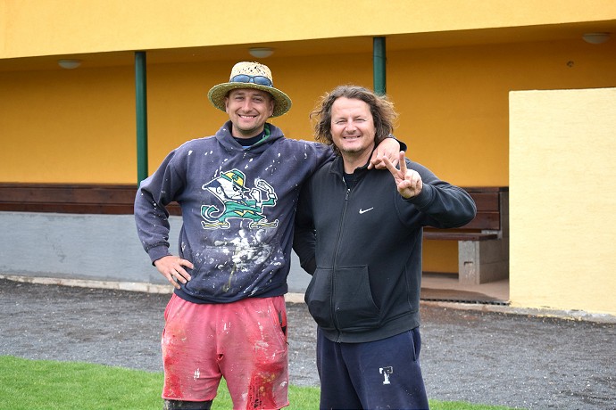 Mládežnícky tréner Angels a nadhadzovač A-tímu Marek Červený s manažérom Romanom Holekšim počas výstavby areálu Angels. Foto: Ján Král
