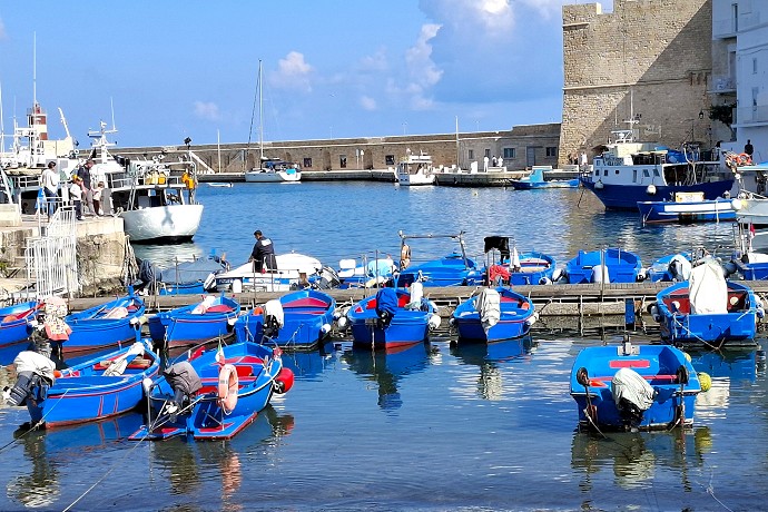 Pre prístav v Monopoli sú typické drevené modro-červené loďky nazývané gozzi.