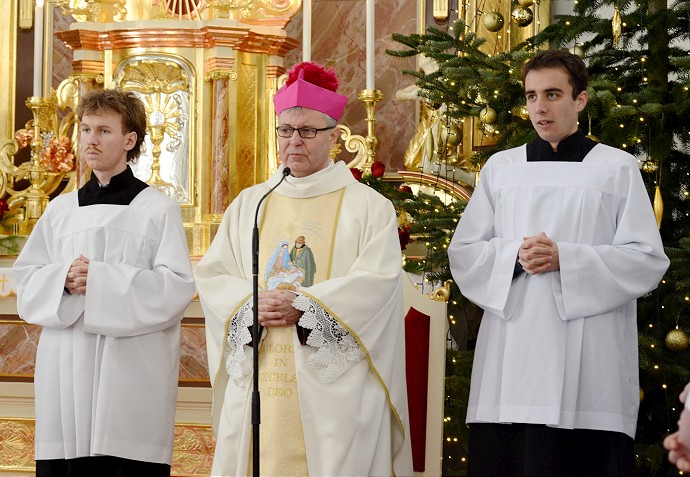 Kaplán Ján Bučík pred oltárom so svojimi miništrantmi.