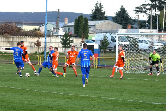 Drahovce mohli napokon v Maduniciach vyhrať, domáci zadáci ale túto strelu Šimona Kunu zblokovali. Foto: Ján Král