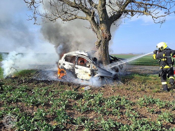 Hasiči po príjazde na miesto udalosti okamžite začali s likvidáciou požiaru a následne z vozidla vyslobodili osobu, ktorá žiaľ utrpela zranenia nezlučiteľné so životom. Foto: HaZZ