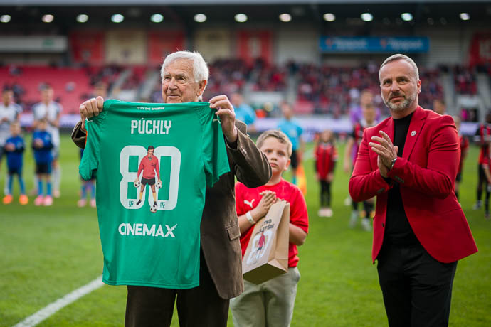Prezident Spartaka Peter Macho odovzdal v mene klubu Jozefovi Púchlemu, bývalému brankárovi Spartaka, pamätný dres k 80. narodeninám. Foto: Peter Kollár