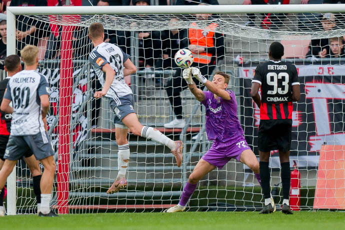V prvom polčase sa brankár Martin Vantruba viackrát zapotil, pri hlavičke Jakuba Luku po priamom kope ukázal dobrý reflex. Foto: Peter Kollár