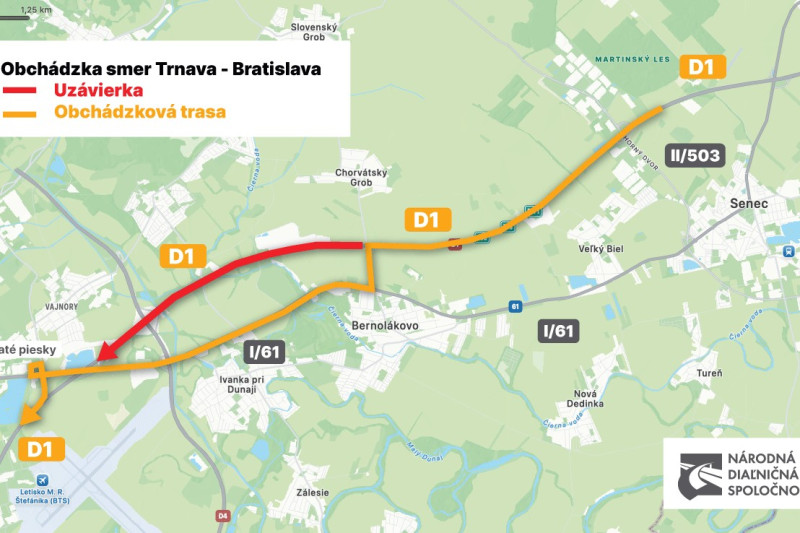 Diaľnica bude uzatvorená od križovatky Bernolákovo na Triblavine po bratislavské Zlaté Piesky. V opačnom smere ostáva doprava nezmenená.