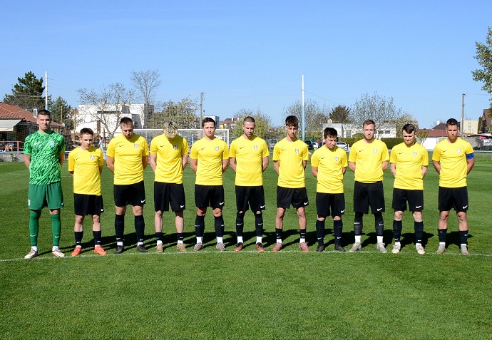 V úvode stretnutia si oba celky minútkou ticha (na fotografii domáca futbalová jedenástka) uctili úmrtie niekdajšieho futbalistu ŠK Cífer 1929, 44-ročného Jozefa Krajčoviča, ktorý zomrel v pondelok 13. apríla. Foto: Marián Pavlík