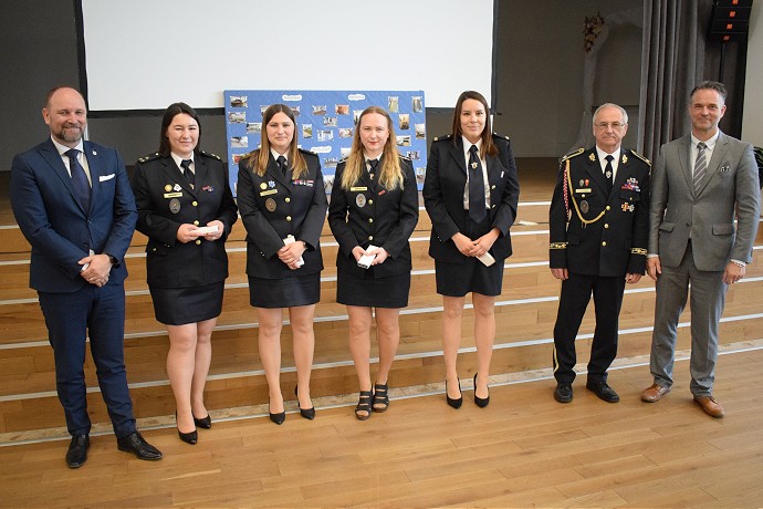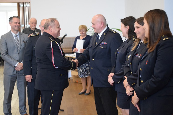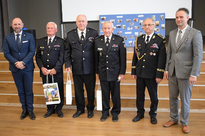Zľava župan Jozef Viskupič, ocenení dlhoroční členovia vedenia DHZ Jaroslav Baláž, Ivan Kyrinovič, Karol Oravec, Územnej organizácie Dobrovoľnej požiarnej ochrany v Trnave Jozef Vadovič a starosta Suchej nad Parnou Martin Glončák.